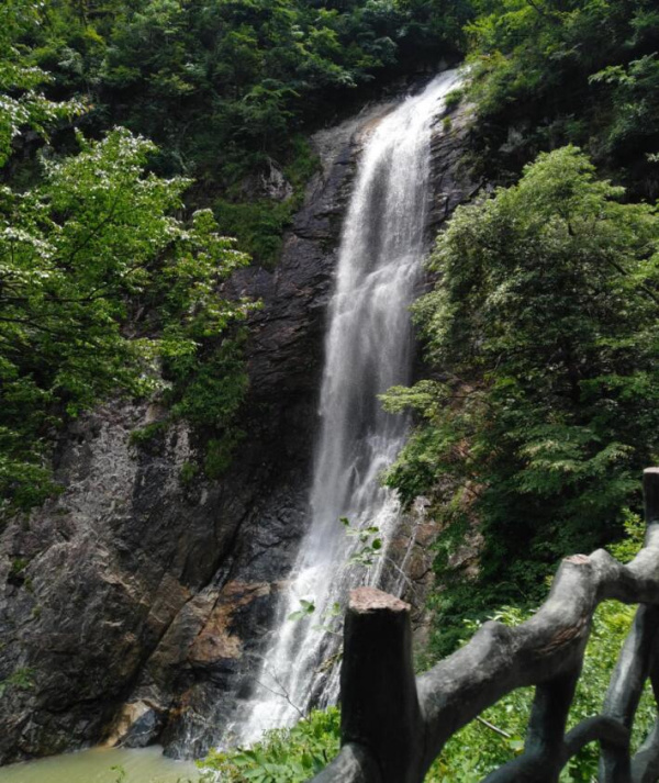 晚上睡了美美的一覺,第二天我們來到了天堂寨。那里風(fēng)景如仙境,云霧繚繞,使得人有身處仙境的感覺。遠(yuǎn)處的山峰已清淡的若隱若現(xiàn),一聲珍禽鳴叫持久而響亮地回蕩在山谷里。嘰嘰喳喳的鳥兒,悉悉索索的蟲鳴環(huán)繞耳周,攀爬在起起伏伏的山巒中,偶爾與從葉縫中鉆進(jìn)來的陽光捉捉迷藏,也為旅途增添了一番別樣的情趣。大家紛紛在瀑布前面合影留念,用相機記錄下美好的瞬間。也許真有世外桃源,這就是天堂寨。